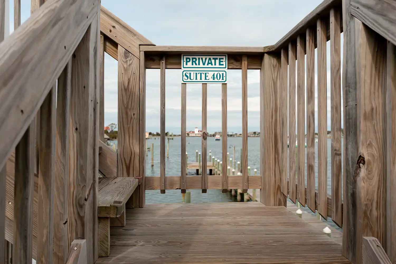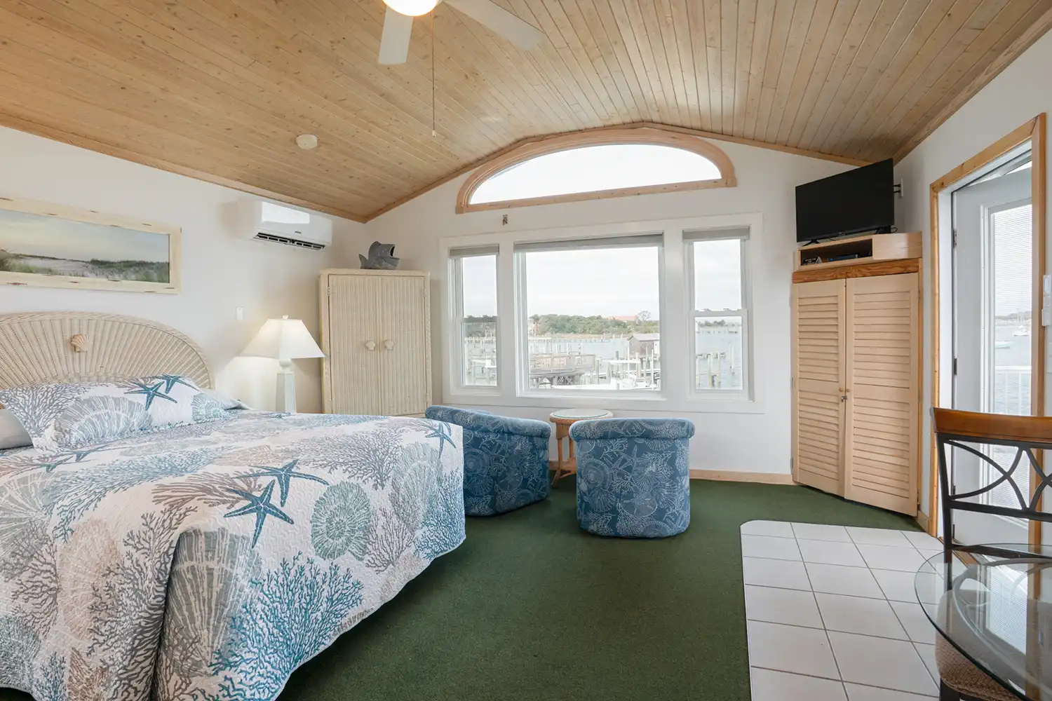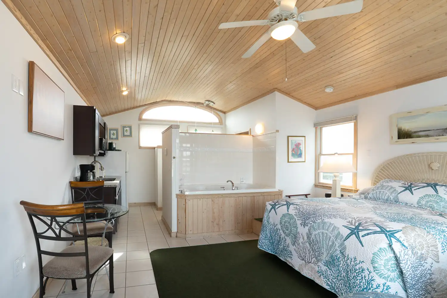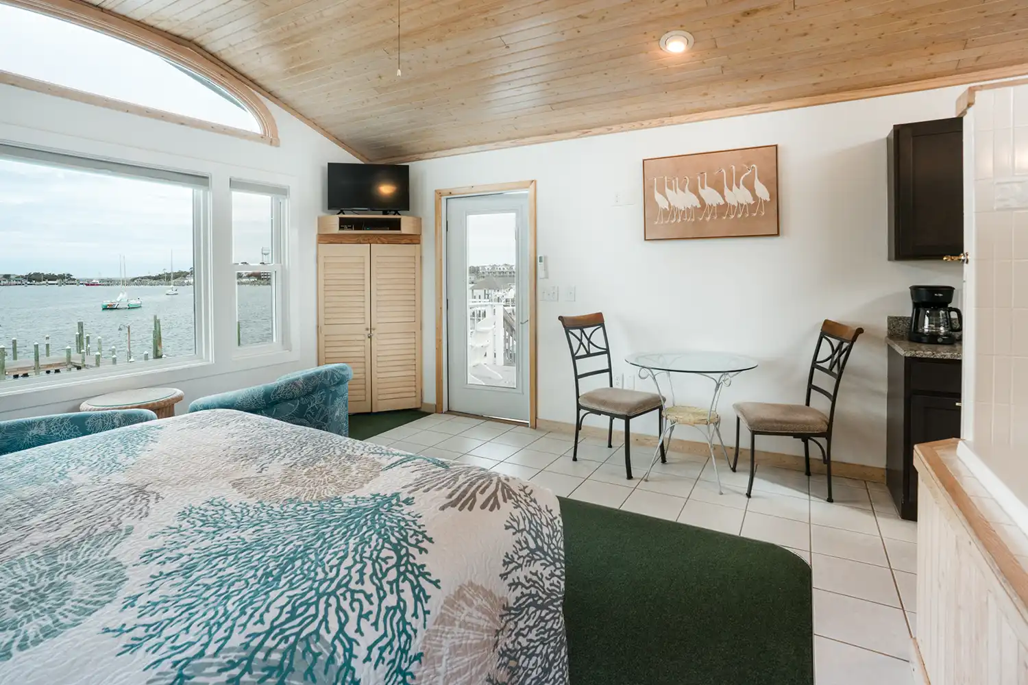 Suite 401 is a harbor-front second floor studio suite located above the office with an open floor plan featuring a queen bed and living area. The suite includes a two-person Jacuzzi tub adjacent to the bed, a kitchenette with an apartment-size refrigerator, microwave, coffee maker, toaster, and blender (no stove), and a large open private deck directly overlooking the harbor. Maximum occupancy: 2 guests.